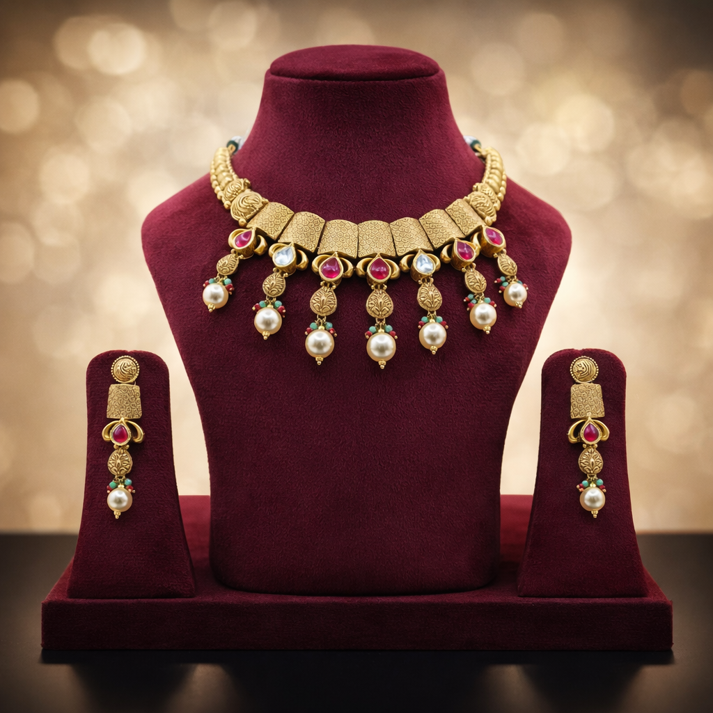 This gold necklace is highlighted with delicate pearl drops that add softness and elegance to the overall look. Designed to sit gracefully on the neckline, it blends traditional detailing with a fresh, modern feel. The matching earrings complete the set, making it perfect for festive wear, daytime functions, and elegant gatherings where you want a refined yet eye-catching style.